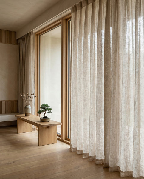 The density of our Linen Sheer Curtains is 90–100 g/m², which creates some privacy while still allowing natural light through. Linen width: 145 cm.