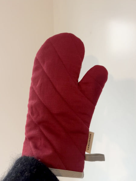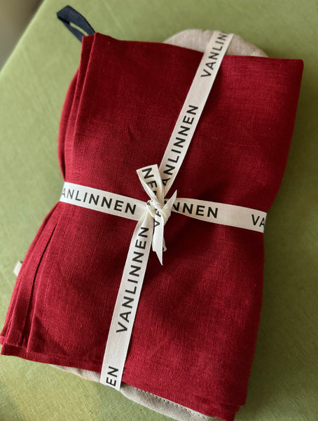 This elegant set includes a single linen mitten in Scarlet Red/Flax colour and a matching kitchen towel, both crafted from 100% natural linen.